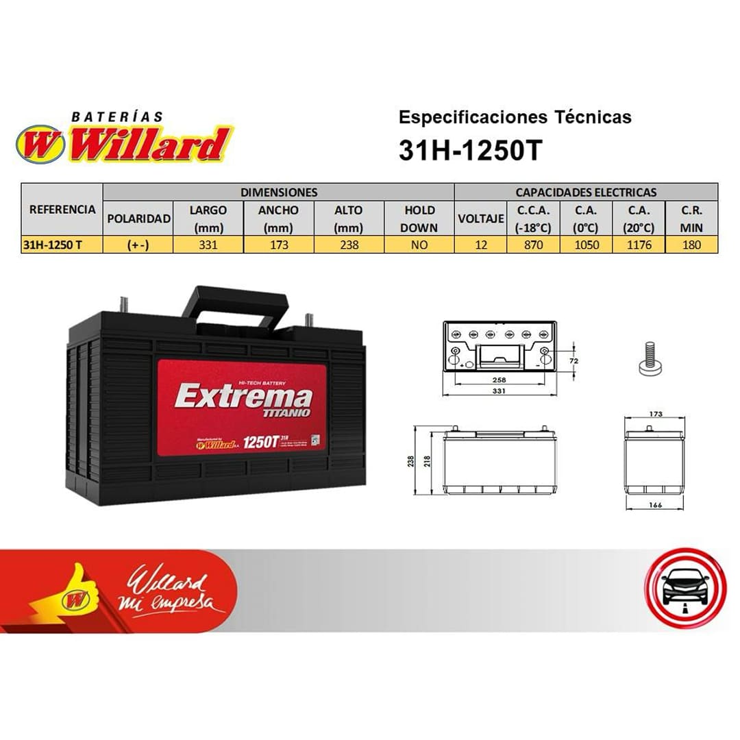 La batería EXTREMA TITANIO 31H- 1250 de 12 Voltios ofrece un arranque potente y confiable para distintos tipos de vehículos. Plomo‑ácido de servicio pesado para camiones, buses y maquinaria con altos requerimientos. Garantiza encendidos rápidos en clima frío o caliente y un suministro estable durante picos de demanda. Su construcción robusta reduce vibraciones y ayuda a lograr una vida útil prolongada, ideal para quienes buscan seguridad y respaldo diario.