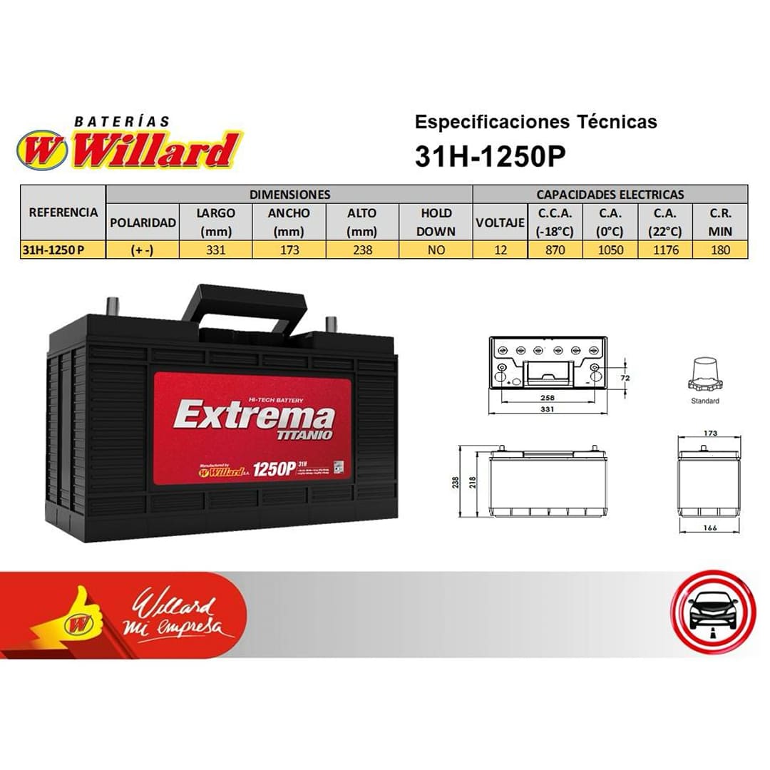 La batería EXTREMA TITANIO 31H- 1250 de 12 Voltios ofrece un arranque potente y confiable para distintos tipos de vehículos. Plomo‑ácido de servicio pesado para camiones, buses y maquinaria con altos requerimientos. Garantiza encendidos rápidos en clima frío o caliente y un suministro estable durante picos de demanda. Su construcción robusta reduce vibraciones y ayuda a lograr una vida útil prolongada, ideal para quienes buscan seguridad y respaldo diario.