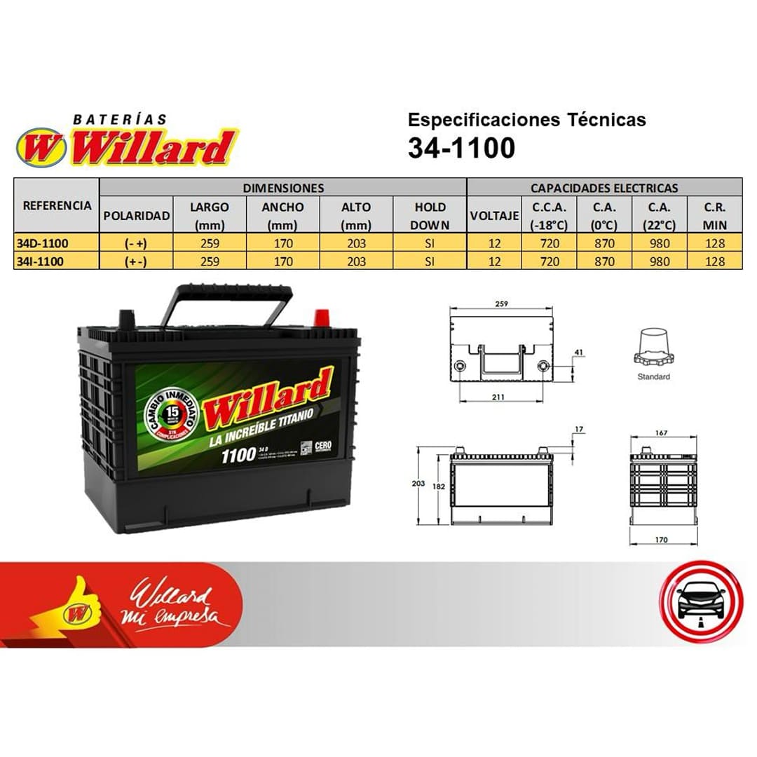 La batería WILLARD 34D- 1100 de 12 Voltios ofrece un arranque potente y confiable para distintos tipos de vehículos. Plomo‑ácido de servicio pesado para camiones, buses y maquinaria con altos requerimientos. Garantiza encendidos rápidos en clima frío o caliente y un suministro estable durante picos de demanda. Su construcción robusta reduce vibraciones y ayuda a lograr una vida útil prolongada, ideal para quienes buscan seguridad y respaldo diario.